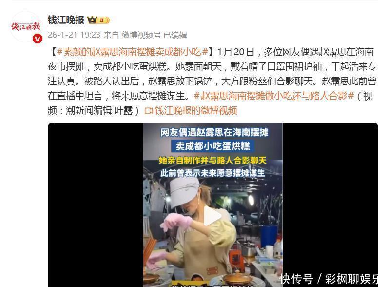 1月20日晚,海南三亚博后村夜市出现了一个画风清奇的蛋烘糕摊位。摊主素颜戴帽,围着围裙套着护袖,熟练地调面糊、烘烤、打包,还贴心给顾客送冰糖葫芦。定价亲民,7元一个,生意不错。谁也想不到,这位忙前忙后的“新手摊主”,竟是演员赵露思。全程没有专业摄影团队,只有私人设备记录,直到收摊前的最后两单,才有眼尖的路人从眉眼间确认了她的身份。她大方合影聊天后,便悄然离场。