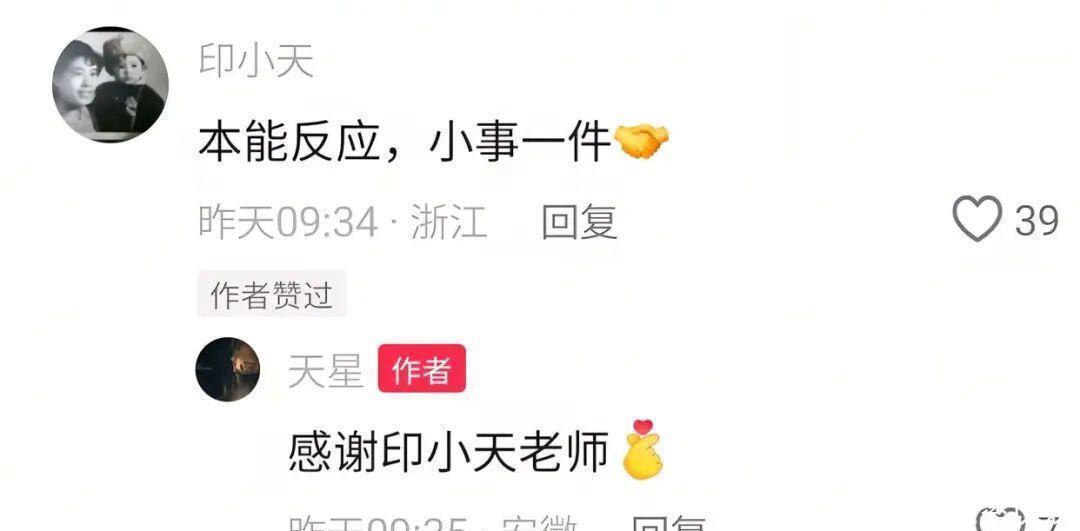 12月10日,印小天个人社交平台账号在宋先生的这条视频下回复表示,“本能反应,小事一件。”宋先生回复,“感谢印小天老师!”