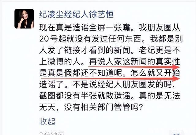 在网上传开后大家都对这样的说法不赞同觉得纪凌尘助理这样的说法未免太恶毒。 随后纪凌尘的经纪人赶紧出来进行了辟谣。 说自己的朋友圈早在二十号之后就没更新过了怎么可能有网上那种言论。