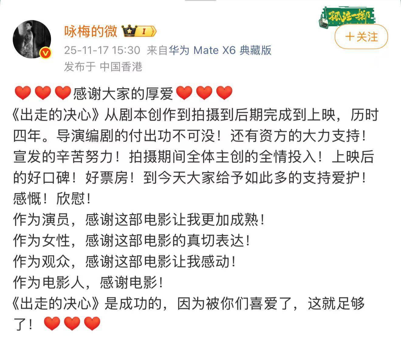 陪跑金鸡奖后,咏梅发文感谢了观众的喜爱,感谢了整个电影团队的付出,更感谢了李红这个角色。