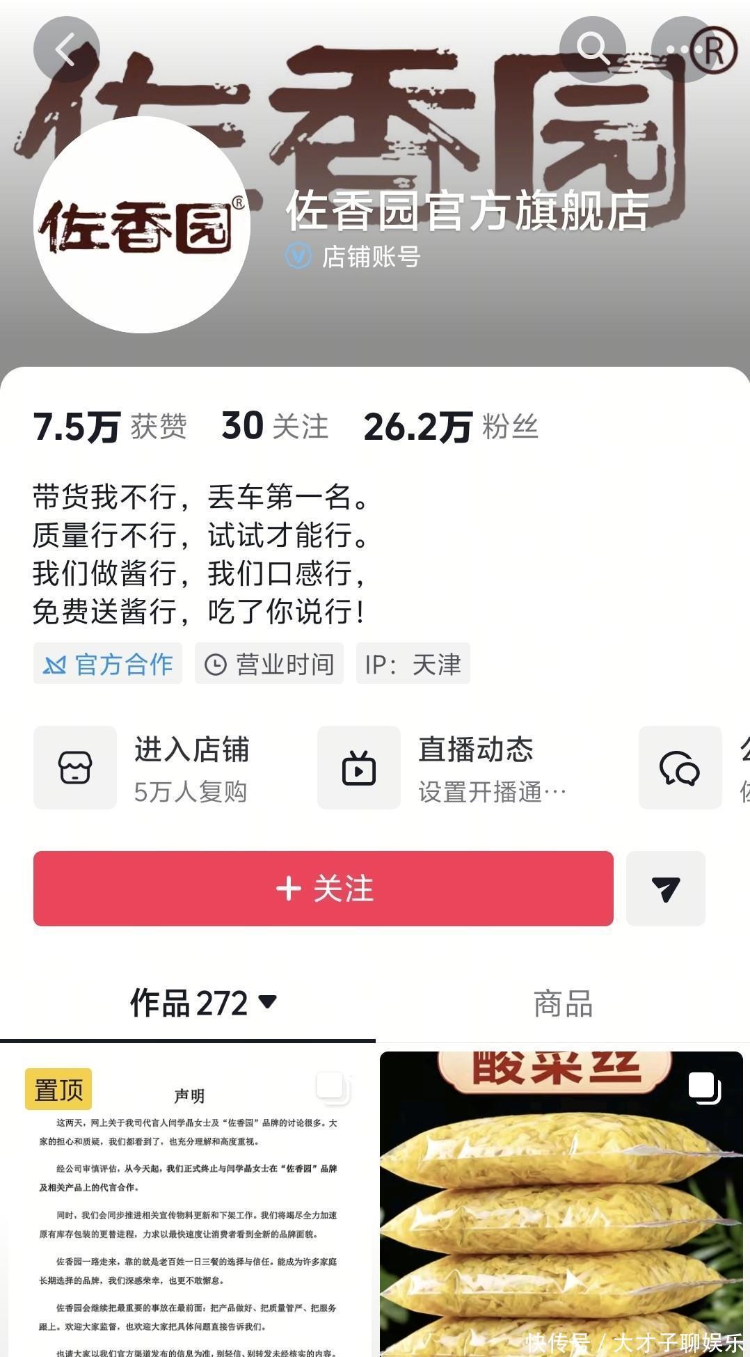 刚才去佐香园社媒看了一眼,除了最新的声明之后,没有更新别的视频,直播间也罕见的暂停了直播。只要佐香园直播满屏就是“酸黄瓜”,再不就是要求换代言人,可能公司正好趁着解约声明发布,也暂停冷静一下舆论。